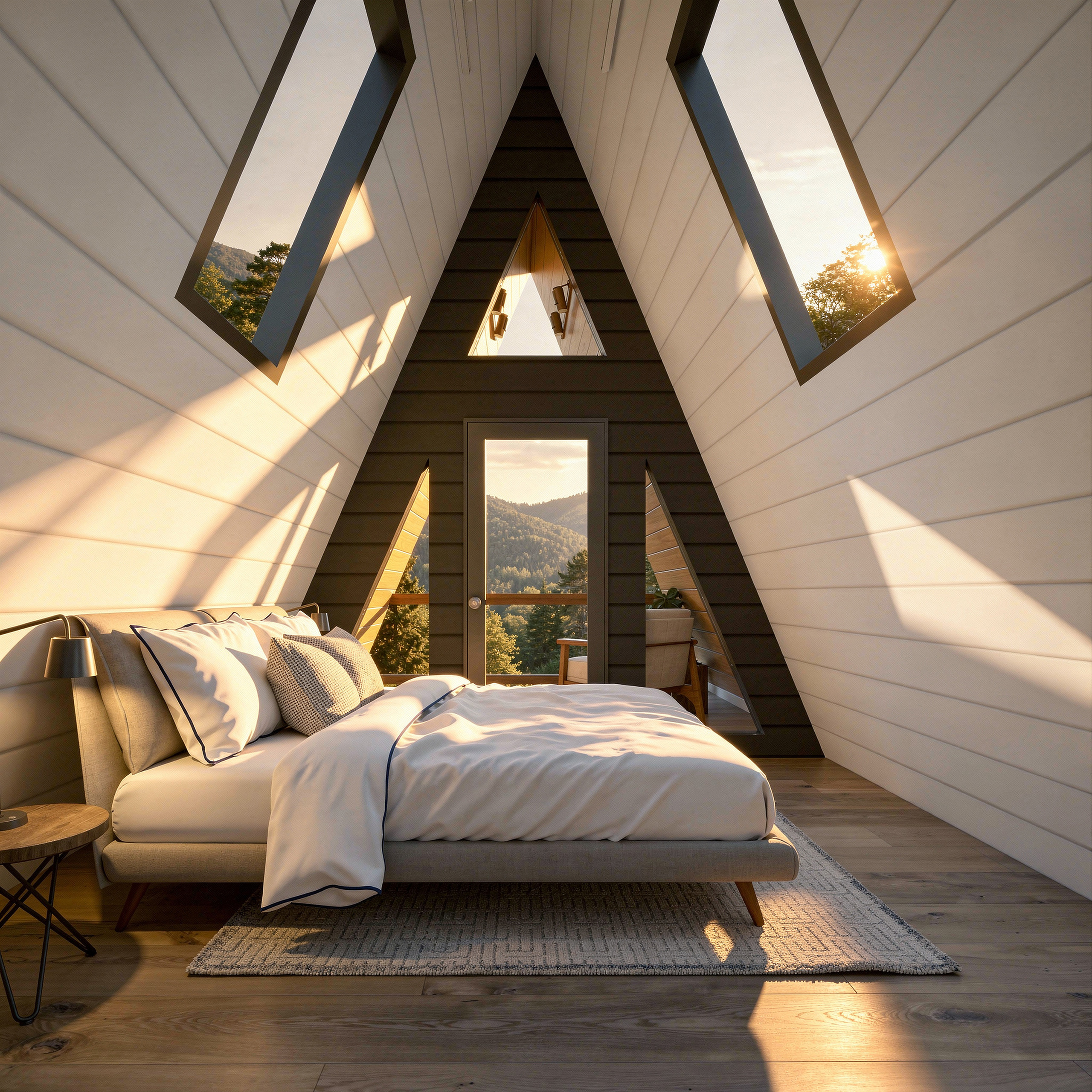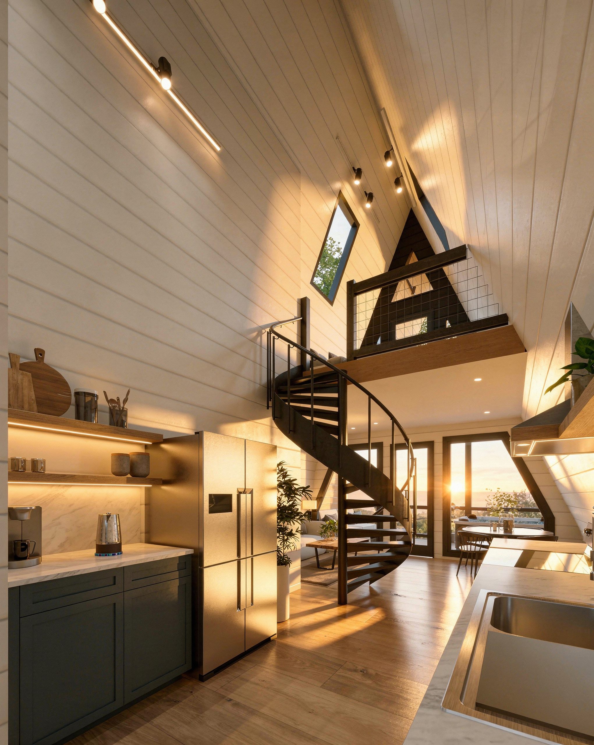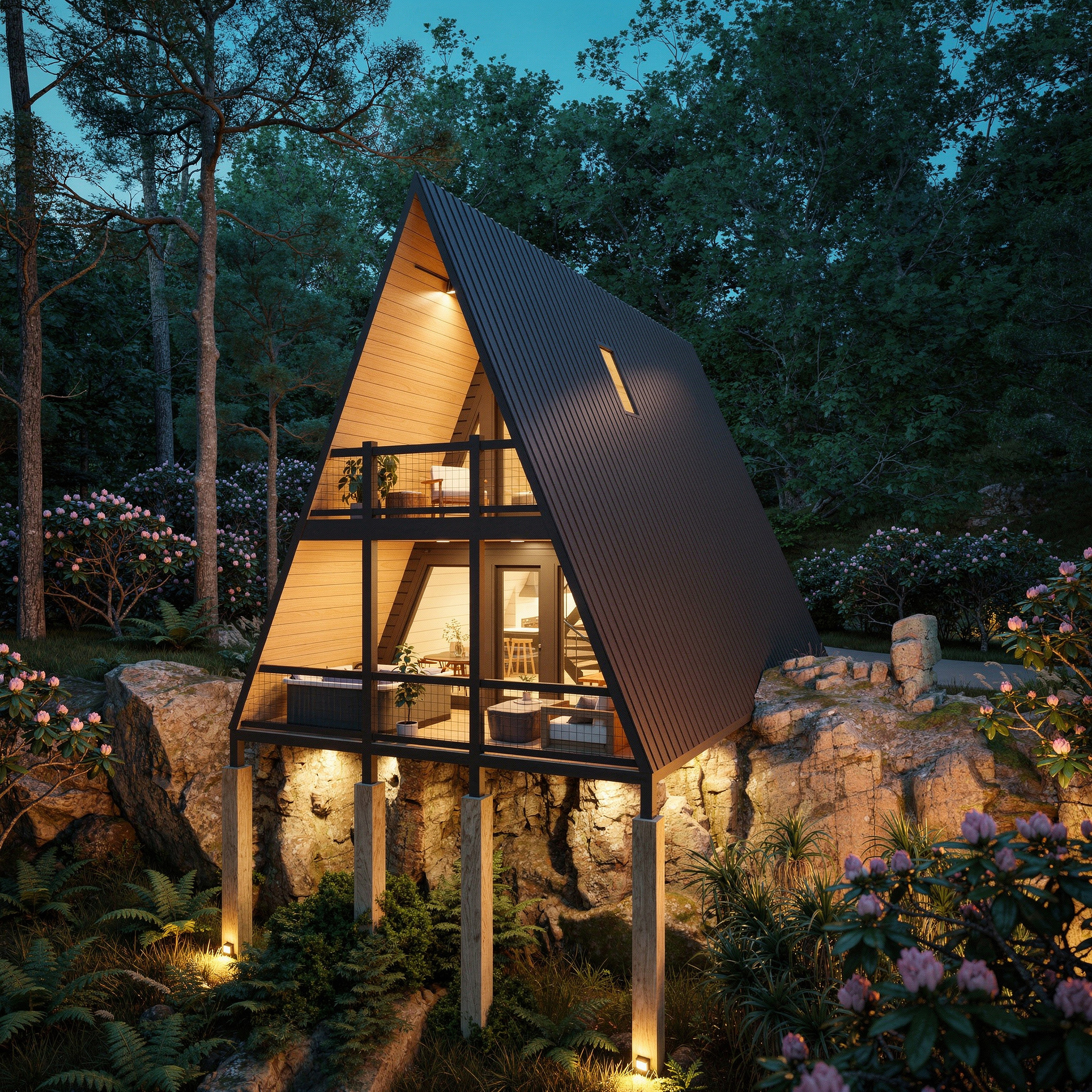 Elevated on piers, this “treehouse” version creates a striking modern cabin feel and works beautifully on sloped terrain. It also includes additional site work, reflected in the price. Watch the tour and browse the photos to experience the view from up high.